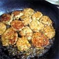 の続き。鶏挽き肉に長葱のみじん(上の青く、かたい部分でよい)塩・こしょう・ごま油少々ここに、じゃが芋をスリスリ。肉が200gに対し1個くらい。メークインだとおろしやすいかな。ここに小麦粉を少々入れてよく混ぜ、スプーンで落とし焼き。やけたら、甘辛に味付けします。これ裂