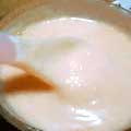 ザワークラウト・各種ソーセージ(一人に3本で三種)・温泉卵・ミルクティー。そして、にんじん、プチトマト、りんごをブレンダーにかけヨーグルトと蜂蜜をかける。