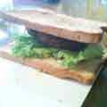 の揚げたてにソースをかけ、パンにはさむ。ワッという高さがでるが、心配はない。これを二つに切って、私の場合はA4のコピー用紙に包み、ジッパーつきの袋に入れる。食べる時には実に丁度いい烈。