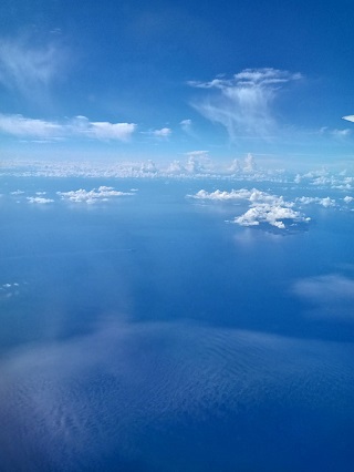 飛行機からの空は、海と空が同じ色できれいでした〜