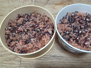 今日は冷凍庫にあった、下茹で済の小豆と少し残ってるササゲの2種豆のお赤飯。