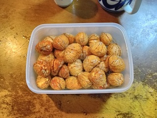 夕飯たべて、1時間ほどテレビみながらゲラゲラ笑っているうち、元気が出てきて、近所の方からいただいた、栗の鬼殻とりあえずむいてみました。