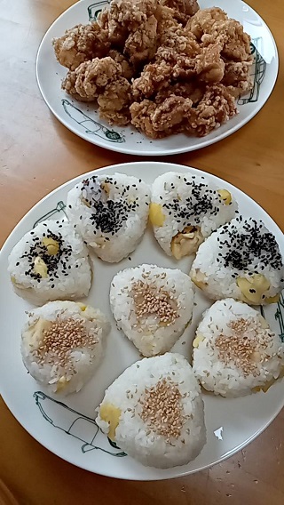 本日、13日のまかないめしは、栗ご飯のおにぎりと鶏のから揚げ。