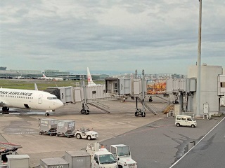 真ん中にいる飛行機のJALのロゴひだりあたりにうっすら白い富士山いるんです。