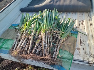 写真は突風と雨の降る、収穫仕立ての葱。トホホ案件でした。