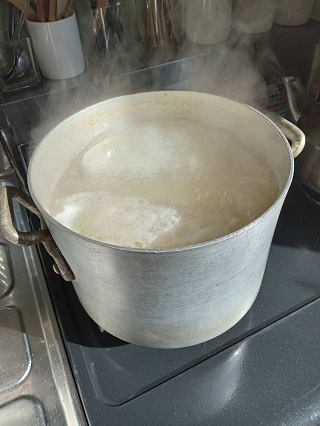 さて、まだまだスープがでますよ〜。お次はたっぷりの水を入れて、3日、60分ずつ毎日火入れをして、最後は、木べらで骨を砕くようにつぶして最後の最後までしっかり濃厚なのをとっていきますよ〜