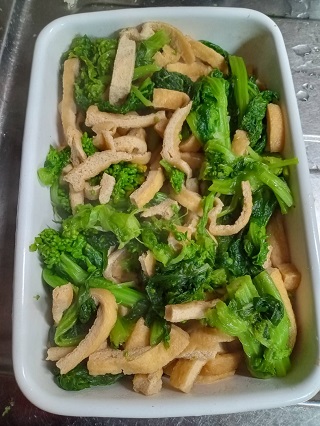 お浸しもいいけれど、しっかりおかずにする一品。油揚げに甘辛に味をつけ、このまま食べても美味しいぞというタイミングで刻んだ菜の花を入れて、強火でさっと火を通します。