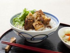 1. 丼に温かいご飯を盛りつけ、刻んだ水菜をのせておく。