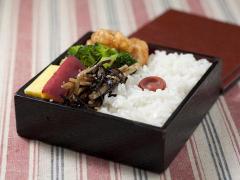 8. 弁当箱の半分にご飯を詰めて、梅干しを真ん中に。あいているところに、おかずを上手につめましょう。