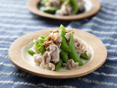 スナップエンドウとゆで豚のにんにく醤油